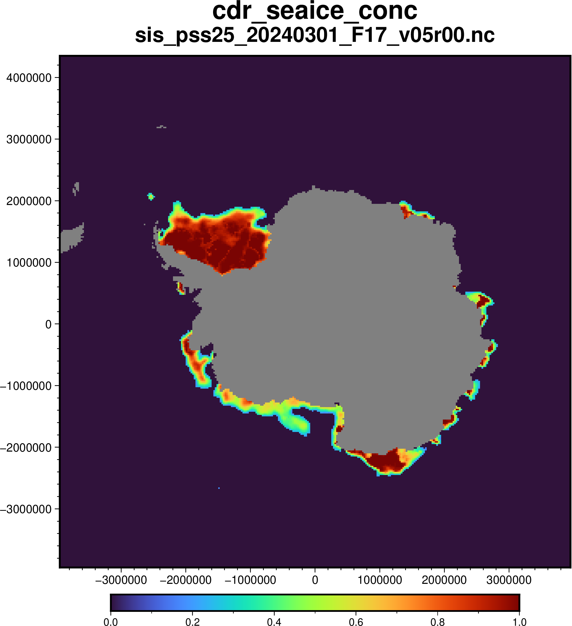 To plot the sea-ice concentration, I have to transform the NetCDF file from kilometers to degree in order to use grdimage. For smoother results, I also oversampled the data to fit the topography resolution I chose (grdsample)