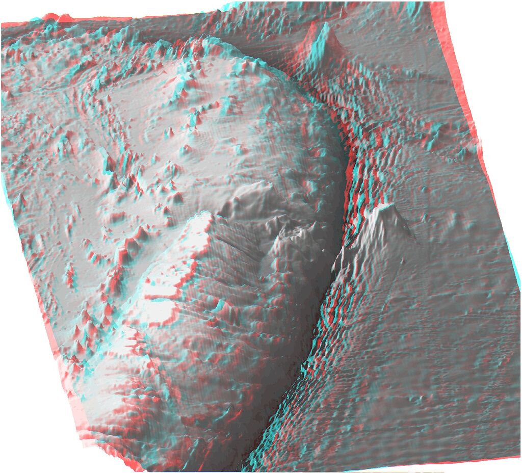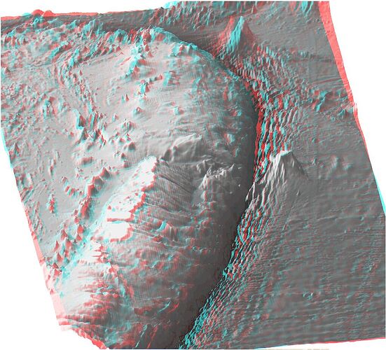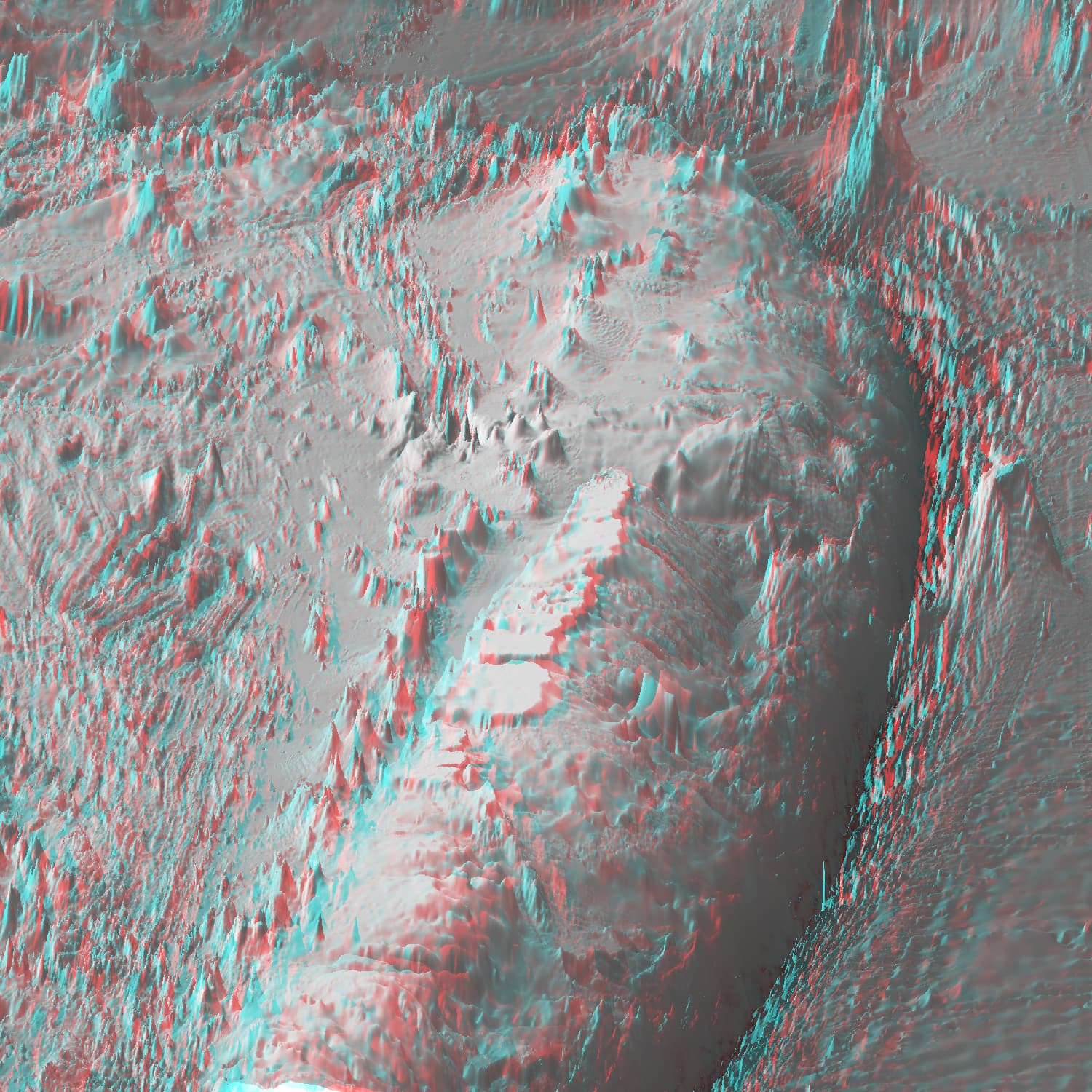 But there’s more. Graphics Magick (and Image Magic) can take the left and right stereograms and turn them into a red-cyan anaglyph. That’s what the last commented out line of the script does. However, the etopo1 colour palette wasn’t particularly good for the anaglyph - probably because of the predominance of blues in the image. If the colour palette is changed to gray, then good results are obtained: