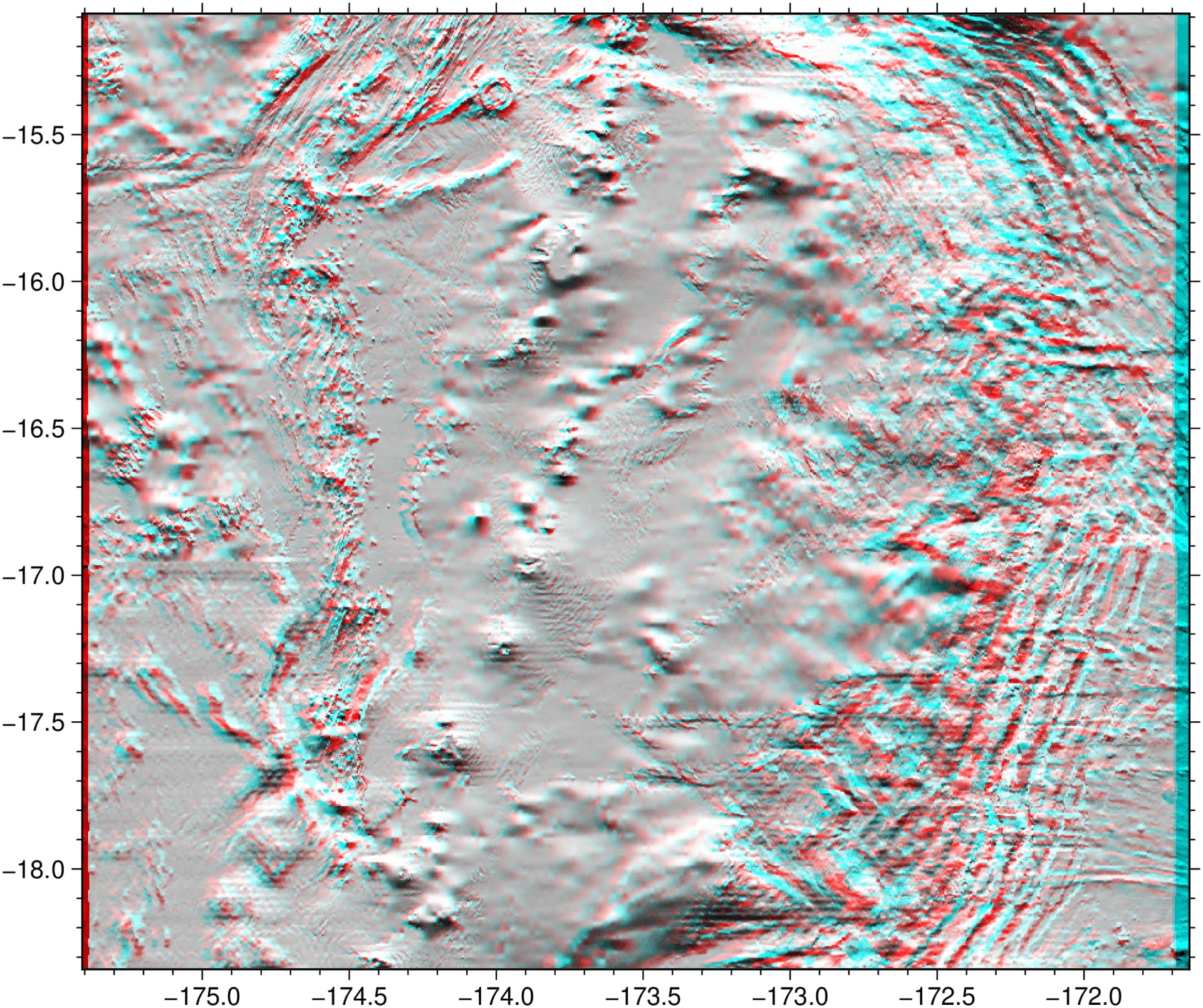 When trying to bring the 3D image in to “focus” it helps to look at Tongatapu (the large island near the centre of the map) until it sort of merges into one. Once you’ve mastered the technique, it’s possible to see even more detail (or at least the illusion of more detail) than simply looking at the normal 2D grdview image.