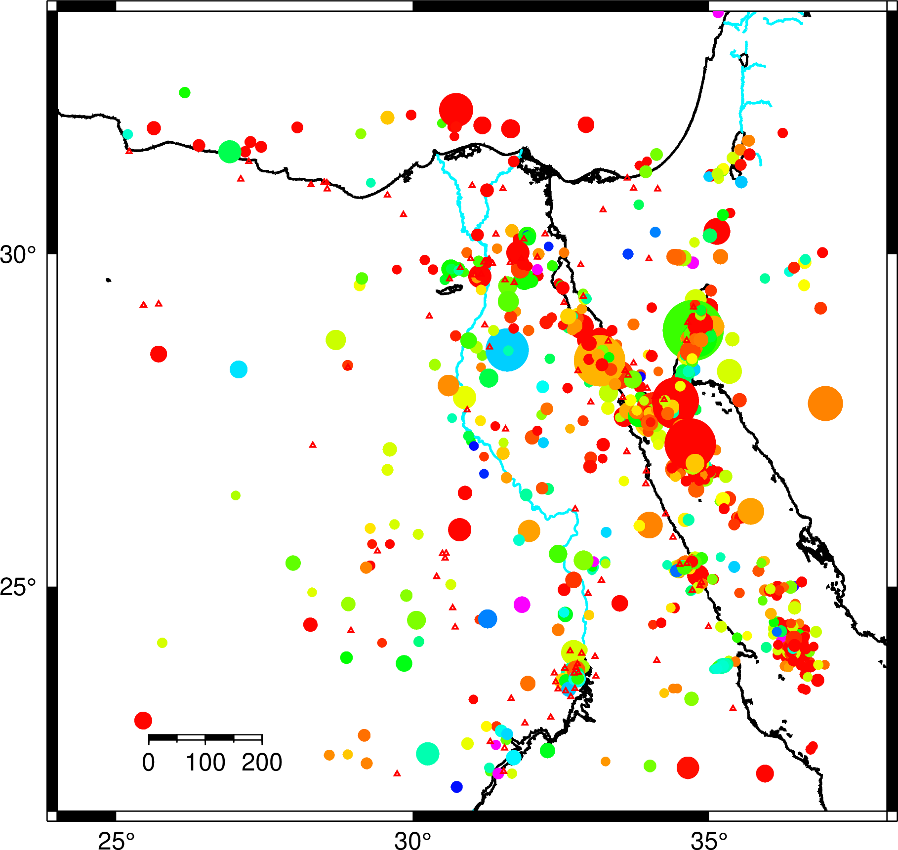 pscoast -Jm0.4i -R24/38/21.5/33.5 -Ba5f0.g0./a5f0.g0.WSen -Lf26.5/22.7/20/200 -Df -A1 -W1p -Ir/1p,turquoise1 -P -V -Swhite -K >> testmap.ps