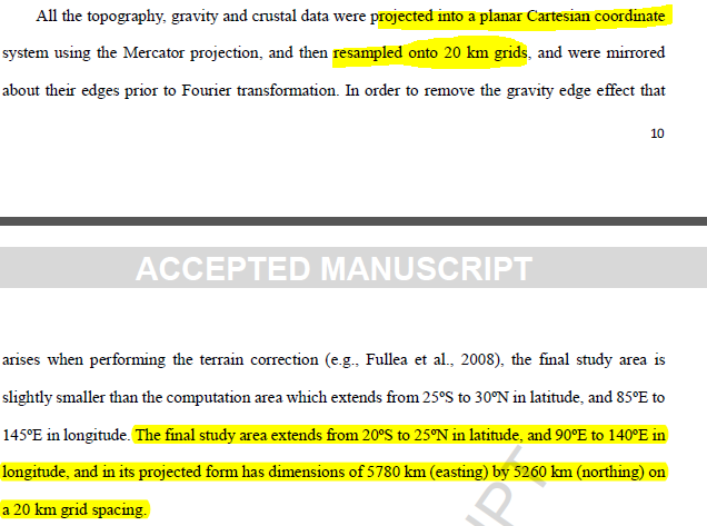 OK Sir, many thank, am grateful. what I just want to do is similar to what is written on the picture I uploaded, I want to convert my data to projected or Cartesian coordinate using Mercator projection, then re sample the projected data on a 20 km grid spacing. You and Andreas have answered me, but am yet to try the re sampling as suggestion from your reply. Many thanks, but how can I know my dimension both easting and northing? I have used GMT to plot many maps but still learning by the way, the aspect of data conversion is an issue since the script online don’t work as expected.