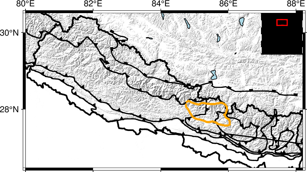 REM gmt plot swarm_work_gorkha.txt -W.12 -Sa.7c -Gyellow -l"Gorkha earthquake"