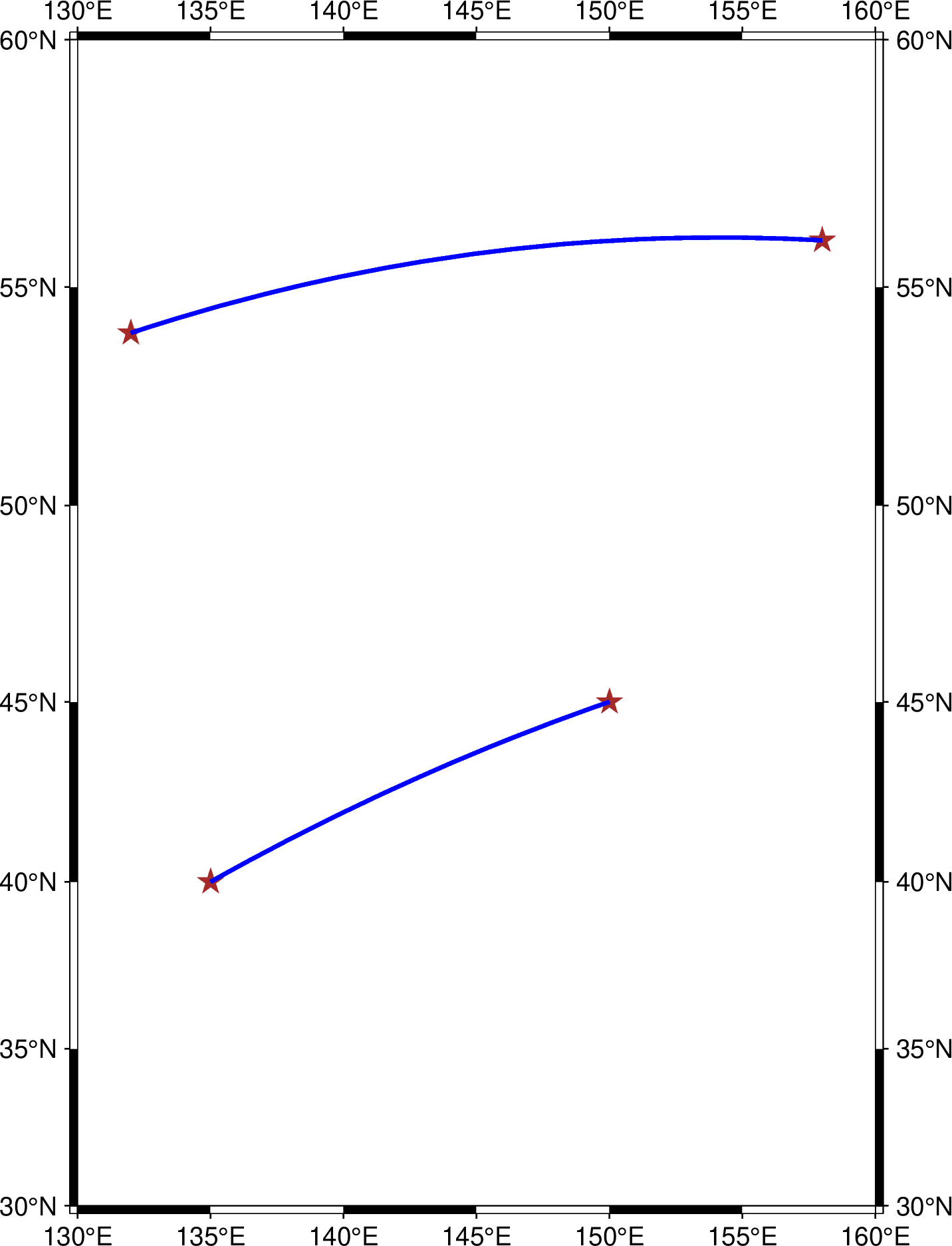 gmt psxy -JM4i -R130/160/30/60 -W1.5,blue << EOF