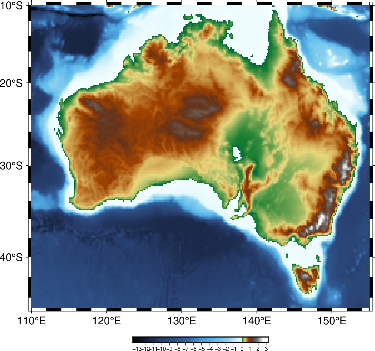 gmt grdimage @earth_relief_10m -Cgeo+Uk+smy.cpt -Vd -R110/155/-45/-10 -JM10c -B -png Australia -Vd